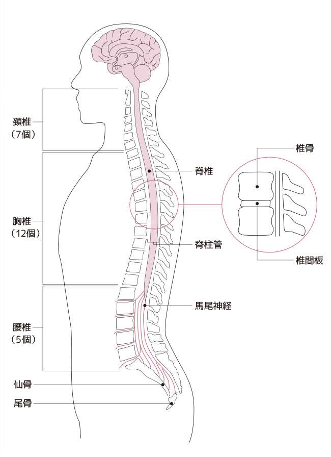 背骨は、椎骨(ついこつ)と呼ばれるブロック状の骨が32〜34個積み重なってできており、頭のほうから順番に「頚椎(けいつい)」「胸椎(きょうつい)」「腰椎(ようつい)」に分かれています。腰椎は、5つの椎骨で構成され、その下にある仙骨、尾骨とつながっています。腰椎を支える役割を担うのが筋肉と靭帯です。正常な腰椎は前方に緩やかなS字カーブを描いています。しかし、腰の周りにある筋肉が衰えると、腰椎にゆがみが生じてカーブが大きくなり、腰痛が起こりやすくなるのです。