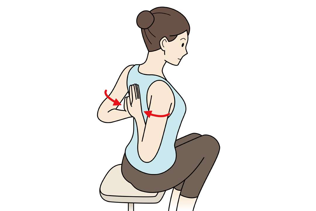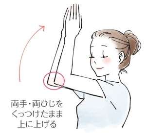 ①胸の前で両手の肘から手のひらまでをピタッとくっつけたまま、アゴの高さまで両肘を上げてみましょう。
