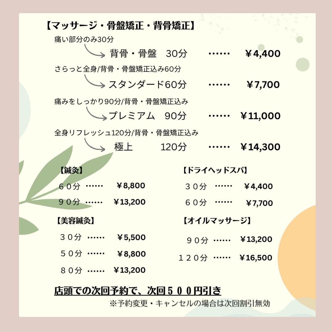 【新百合ヶ丘mana整骨院】9月よりコース及び価格改定を致します。
