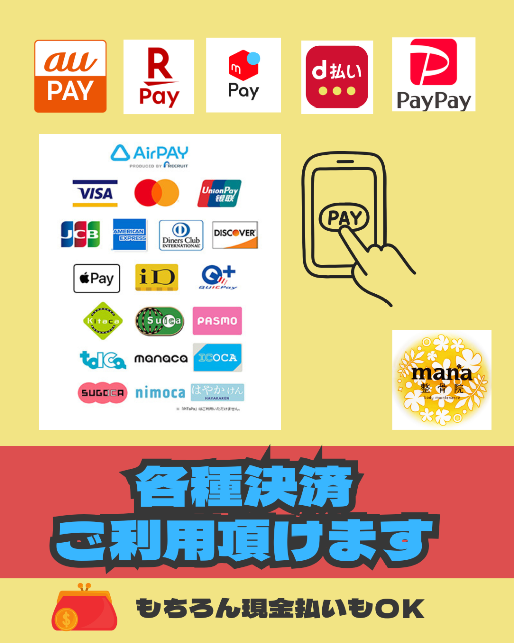 mana整骨院では各種キャッシュレス決済取り扱い有り