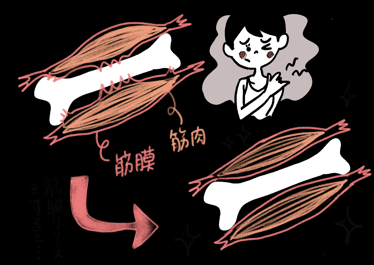 ※筋膜リリースとは・・・筋肉の癒着を引き剥がしたり引き離したりねじれや拘縮を解き解すこと。
